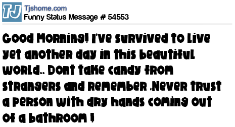 X says Good Morning! I've survived to live yet another day in this beautiful world.. Dont take candy from strangers and remember ,Never trust a person with dry hands coming out of a bathroom !