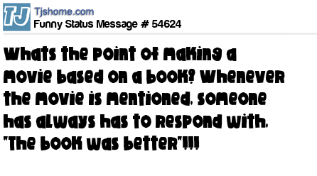 X says Whats the point of making a movie based on a book? Whenever the movie is mentioned, someone has always has to respond with, "The book was better"!!!