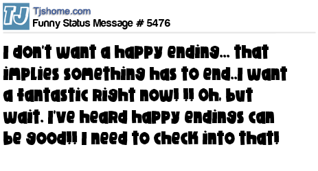 X says I don't want a happy ending... that implies something has to end..I want a fantastic right now! !! Oh, but wait. I've heard happy endings can be good!! I need to check into that!