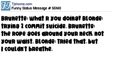 X is Brunette: what r you doing? Blonde: trying 2 commit suicide. Brunette: the rope goes around your neck, not your waist. Blonde: Tried that, but I couldn't breathe.