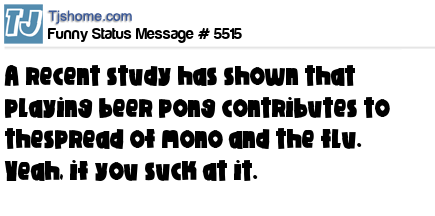 - # 12381 A recent study has shown that playing beer pong contributes to the spread of mono and the flu. Yeah, if you suck at it