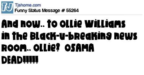 X is and now.. to Ollie Williams in the Black-u-breaking news room.. Ollie? OSAMA DEAD!!!!!