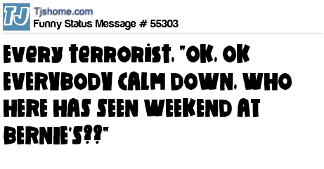 X Every terrorist, "OK, OK EVERYBODY CALM DOWN, WHO HERE HAS SEEN WEEKEND AT BERNIE'S??"