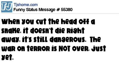 X says When you cut the head off a snake, it doesn't die right away, it's still dangerous. The war on terror is NOT over, just yet.