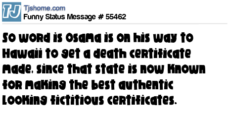 X says So word is Osama is on his way to Hawaii to get a death certificate made, since that state is now known for making the best authentic looking fictitious certificates.