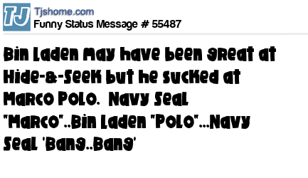 X Bin Laden may have been great at Hide-&-Seek but he sucked at Marco Polo. Navy Seal "Marco"..Bin Laden "Polo"...Navy Seal 'Bang..Bang'