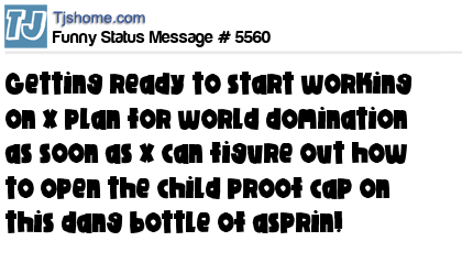 X is getting ready to start working on x plan for world domination as soon as x can figure out how to open the child proof cap on this dang bottle of asprin!