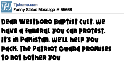 X Dear Westboro Baptist Cult, we have a funeral you can protest. It's in Pakistan, we'll help you pack. The Patriot Guard promises to not bother you