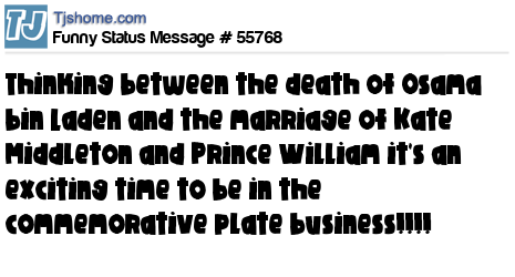 X is thinking between the death of Osama bin Laden and the marriage of Kate Middleton and Prince William it's an exciting time to be in the commemorative plate business!!!!