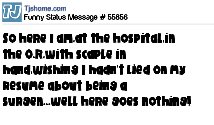 X So here I am,at the hospital,in the O.R,with scaple in hand,wishing I hadn't lied on my resume about being a surgen...well here goes nothing!