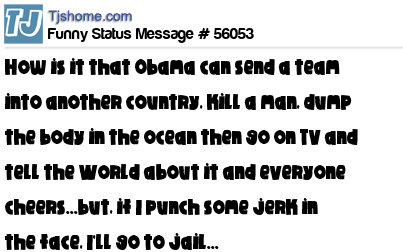 X How is it that Obama can send a team into another country, kill a man, dump the body in the ocean then go on TV and tell the World about it and everyone cheers...but, if I punch some jerk in the face, I'll go to jail...
