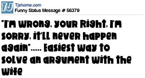 X "I'm wrong, your Right, I'm sorry, it'll never happen again"..... Easiest way to solve an argument with the wife