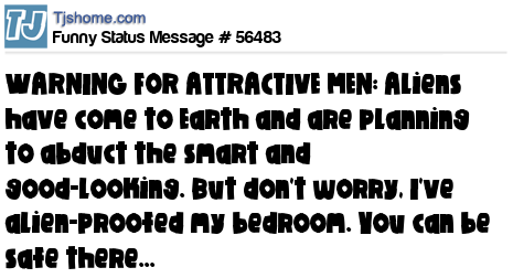X WARNING FOR ATTRACTIVE MEN: Aliens have come to Earth and are planning to abduct the smart and good-looking. But don't worry, I've alien-proofed my bedroom. You can be safe there...