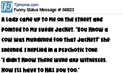 - # 42020 A lady came up to me on the street and pointed at my suede jacket. ‘You know a cow was murdered for that jacket?' she sneered. I replied in a psychotic tone, ‘I didn't know there were any witnesses. Now I'll have to kill you too.