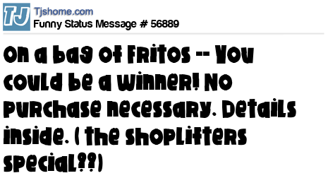 X On a bag of Fritos -- You could be a winner! No purchase necessary. Details inside. ( the shoplifters special??)