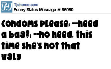 - # 119398 i just bought condoms, and when the cashier asked me if I needed a bag I jus said "No,... shes not that ugly!".