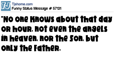 - # 57375 “... of that day and hour no one knows, not even the angels of heaven, nor the Son, but the Father alone.” Matthew 24:36..If God has not even revealed to his own son the date the world will end, I doubt he has revealed it to Harold Camping.
