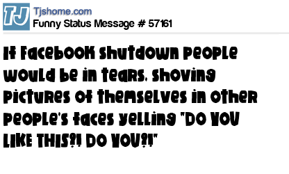 - # 98588 If Facebook ever shuts down. You'll see people roaming the streets shoving pictures in others faces screaming 'Do you like this!?!?!.. DO YOU!?!?!'