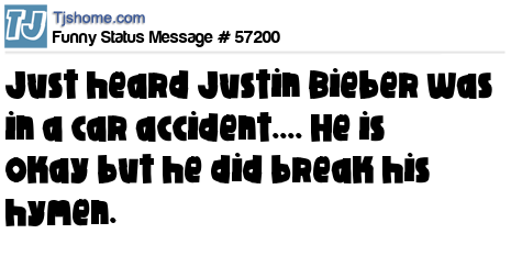 X just heard Justin Bieber was in a car accident.... He is okay but he did break his hymen.