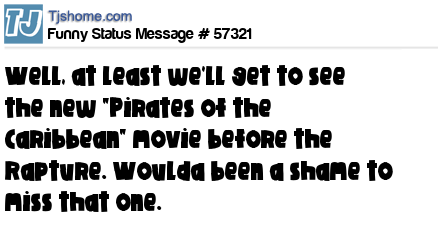 X Well, at least we'll get to see the new "Pirates of the Caribbean" movie before the Rapture. Woulda been a shame to miss that one.