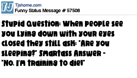 X is Stupid Question: When people see you lying down with your eyes closed they still ask: "Are you sleeping?" Smartass Answer - "No, I'm training to die!"