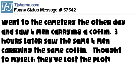 X is Went to the cemetery the other day and saw 4 men carrying a coffin. 3 hours later saw the same 4 men carrying the same coffin. Thought to myself; they've lost the plot!
