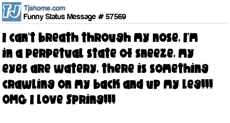 X says I can't breath through my nose, I'm in a perpetual state of sneeze, my eyes are watery, there is something crawling on my back and up my leg!!! OMG I love Spring!!!