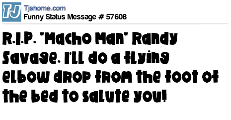 X R.I.P. "Macho Man" Randy Savage. I'll do a flying elbow drop from the foot of the bed to salute you!