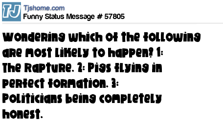X is wondering which of the following are most likely to happen? 1: The Rapture. 2: Pigs flying in perfect formation. 3: Politicians being completely honest.