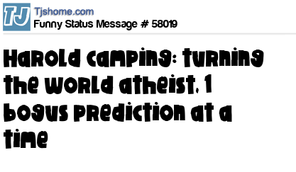 - # 58164 wondering if Harold Camping is going to stop picking random dates for the end of the world when we reach 2013 and his Mayan calender has expired