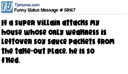 X If a super villain attacks my house whose only weakness is leftover soy sauce packets from the take-out place, he is so f'ked.