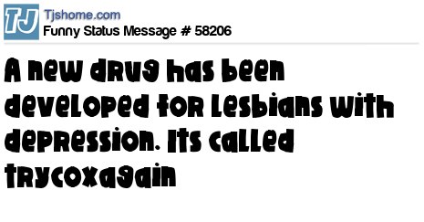 - # 19967 Hav you heard of the new drug doctors r giving to depressed lesbians??..its called TRYDICAGAIN!!
