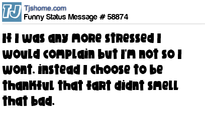 X if I was any more stressed I would complain but I'm not so I wont. instead I choose to be thankful that fart didnt smell that bad.