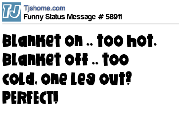 - # 52869 Blanket on, too hot. Blanket off,too cold. One leg out, perfect,until the awkward moment when the demon from Paranormal Activity grabs it..