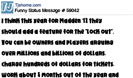 X is I think this year for Madden '12 they should add a feature for the "lock out". You can be owners and players arguing over millions and billions of dollars, charge hundreds of dollars for tickets, work about 5 months out of the year and never have to worry