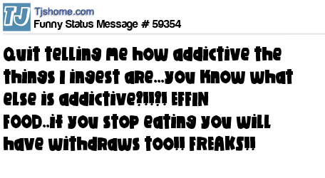 X quit telling me how addictive the things I ingest are...you know what else is addictive?!!?! EFFIN FOOD..if you stop eating you will have withdraws too!! FREAKS!!