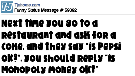 - # 74441 umm can I have a coke?” “is pepsi ok?” “I dont know is monopoly money ok?”