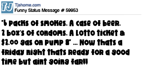 X is "6 packs of smokes. A case of beer. 2 box's of condoms. A lotto ticket & $2.00 gas on pump 8" ... Now thats a friday night thats ready for a good time but aint going far!!