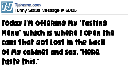 X Today I'm offering my "Tasting Menu" which is where I open the cans that got lost in the back of my cabinet and say, "Here, taste this."