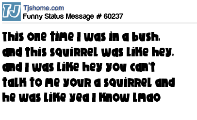 X says this one time I was in a bush, and this squirrel was like hey, and I was like hey you can't talk to me your a squirrel and he was like yea I know lmao
