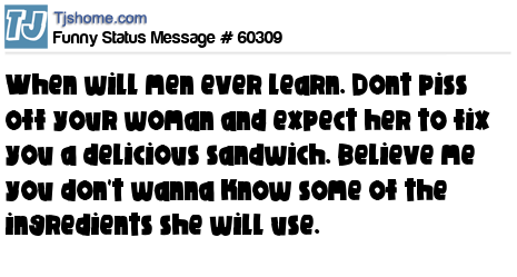 X is When will men ever learn. Dont piss off your woman and expect her to fix you a delicious sandwich. Believe me you don't wanna know some of the ingredients she will use.