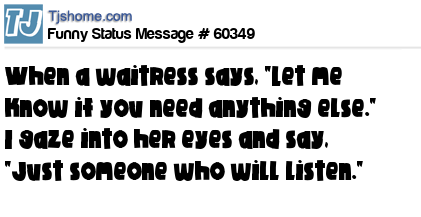 X When a waitress says, "Let me know if you need anything else." I gaze into her eyes and say, "Just someone who will listen."