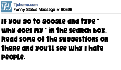 X is If you go to google and type " why does my " in the search box. Read some of the suggestions on there and you'll see why I hate people.