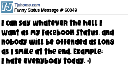X I can say whatever the hell I want as my Facebook Status, and nobody will be offended as long as I smile at the end. Example: I hate everybody today. :)