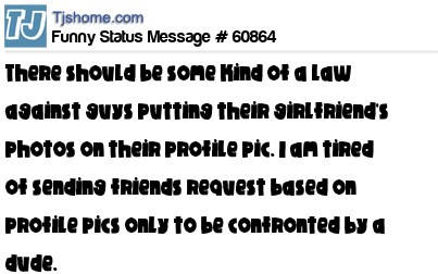 X is There should be some kind of a law against guys putting their girlfriend's photos on their profile pic. I am tired of sending friends request based on profile pics only to be confronted by a dude.