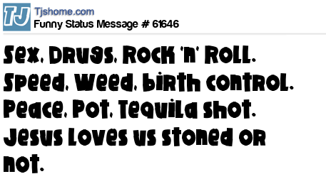 X Sex, Drugs, Rock 'n' Roll. Speed, Weed, birth control. Peace, Pot, Tequila shot. Jesus loves us stoned or not.