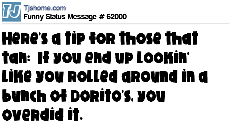 X says Here's a tip for those that tan: If you end up lookin' like you rolled around in a bunch of Dorito's, you overdid it.