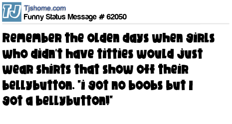 X is Remember the olden days when girls who didn't have titties would just wear shirts that show off their bellybutton. "i got no boobs but I got a bellybutton!"