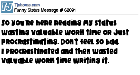 X So you're here reading my status wasting valuable work time or just procrastinating. Don't feel so bad, I procrastinated and then wasted valuable work time writing it.