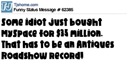 - # 67350 Some idiot just bought MySpace for 35 million. Now looks like the ideal time to sell my dusty old CD towers for 9 million dollars.